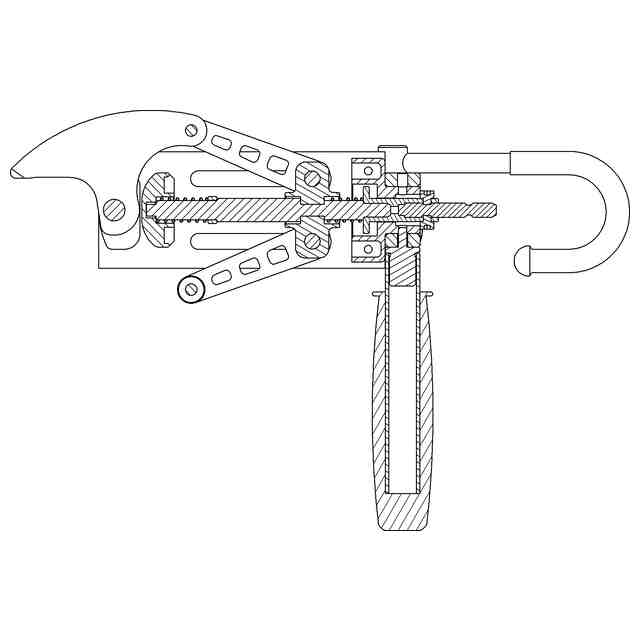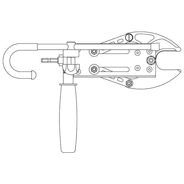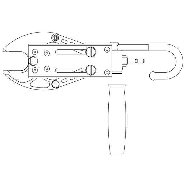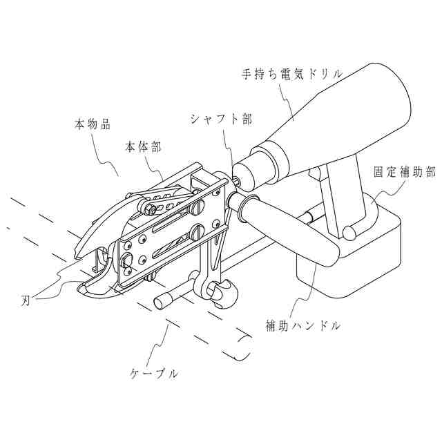 本物品は、手持ち電気ドリル等に取り付けられてケーブルや電線管等の配線・配管材を切断する切断工具に関するものである。使用状態参考図により説明すると、本物品は、シャフト部を手持ち電気ドリルに接続し、当該手持ち電気ドリルを回転させることで一対の刃が閉まりケーブルを切断することができる。なお、本物品の刃を備える本体部は前記シャフト部の延びる方向を軸方向としてその周方向に回動自在である。