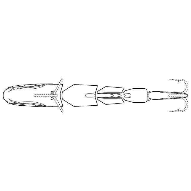 図中に実線で表された部分が意匠登録を受けようとする部分である。色彩を施した状態を示す参考図1~12は、物品表面に色彩を施したものを示したものであり、フック、後端側のテール部を省略したものである。特に色彩を施した状態を示す参考図11~12は、本体部に透過性素材を用いたものである。背面図は、正面図と対称にあらわれるため省略する。