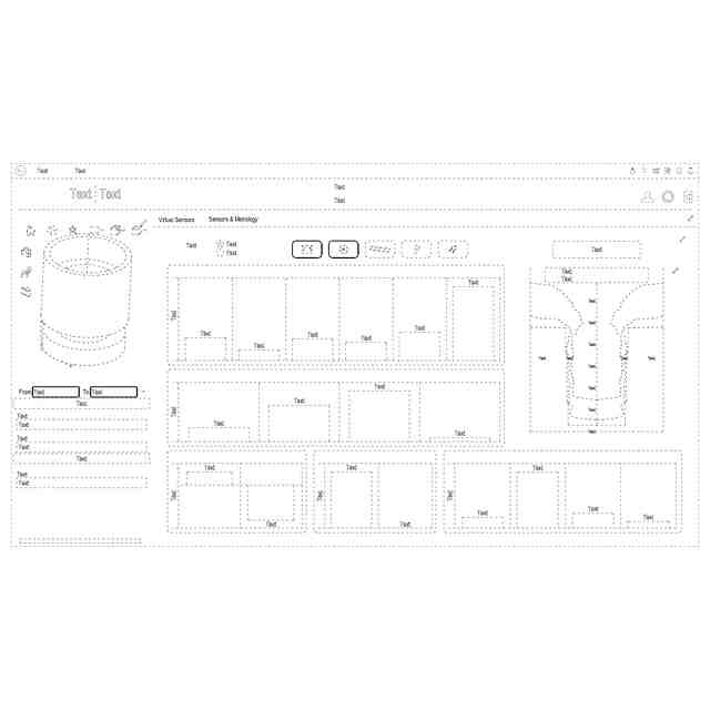 画像図は、グラフィカルユーザインタフェースを有するディスプレイパネルに表示される情報を表示するための画像である。具体的には、センサにより取得したデータを解析するためのものである。「Virtual Sensors」部分をクリックすると、仮想センサにより取得したデータが表示され、「Sensors & Metrology」部分をクリックすると、現実のセンサにより取得したデータが表示される。「Sensors & Metrology」部分の下段に複数並んでいる丸みを帯びた角を有する四角形は、解析データに関する情報を表す。左の列に表示される「From」と「To」との間の四角をクリックすることで、解析を希望するデータ範囲の上限及び下限を指定することができる。