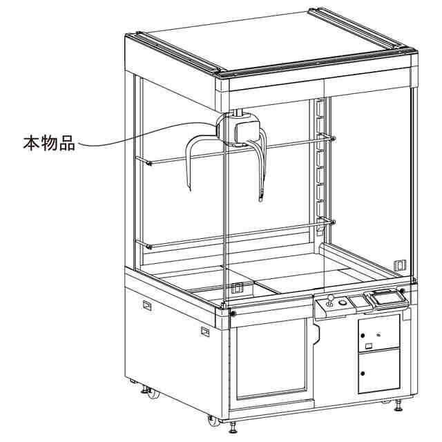 本物品は、「使用状態を示す参考斜視図」に示すように、景品取得ゲーム機内で景品を獲得するための把持具である。本物品には景品把持用のアームが備え付けられ、遊戯者の操作に応じて把持具の内部に設けられた図示しないアーム開閉装置によってアームは開閉する。「フェイスカバーを別箇所に取り付けた状態を示す参考斜視図」に示すように、ポップ広告等を差し込むフェイスカバーを任意の位置に付け替えることができる。