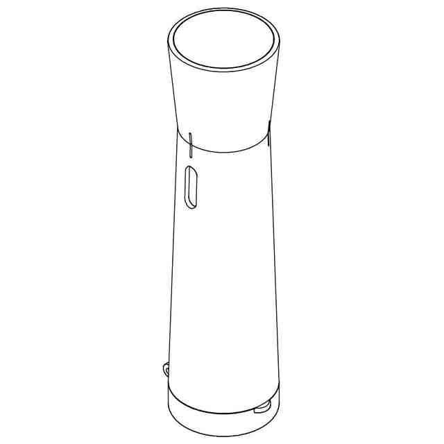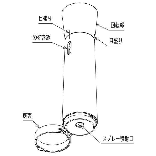 この意匠に係る物品は、包装用噴霧容器であって、例えば食用の液体香料などを充填したスプレーを装着して使用されるものである。使用方法を示す参考図に示すとおり、底蓋を開け、回転部を回転させることで、スプレー内容物が噴射口より噴霧される。