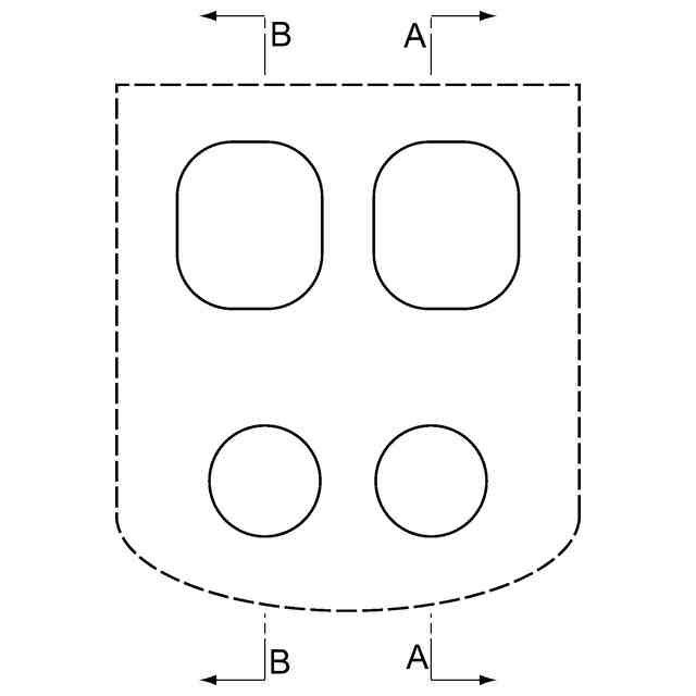 実線で示した部分が、意匠登録を受けようとする部分である。左側面図は右側面図と同一に表れるため省略する。B-B断面図はA-A断面図と対称に表れるため省略する。