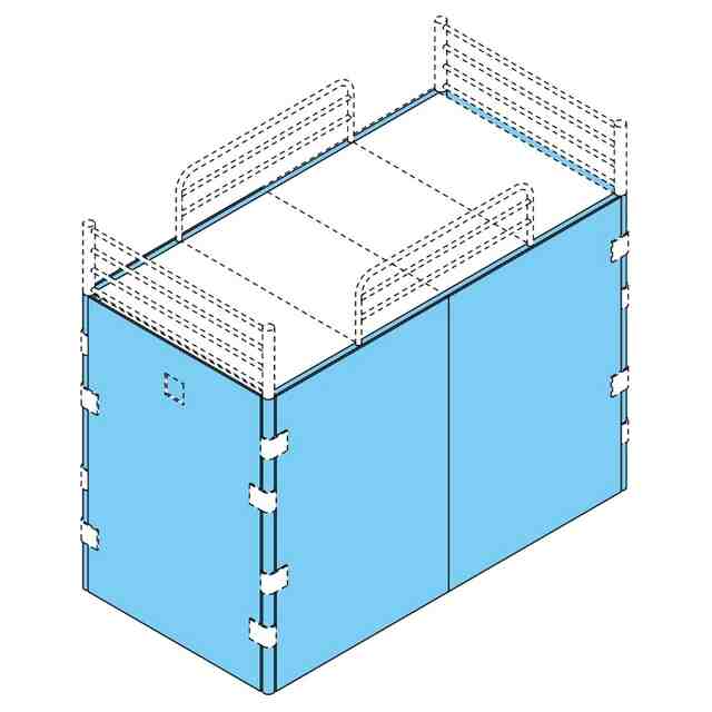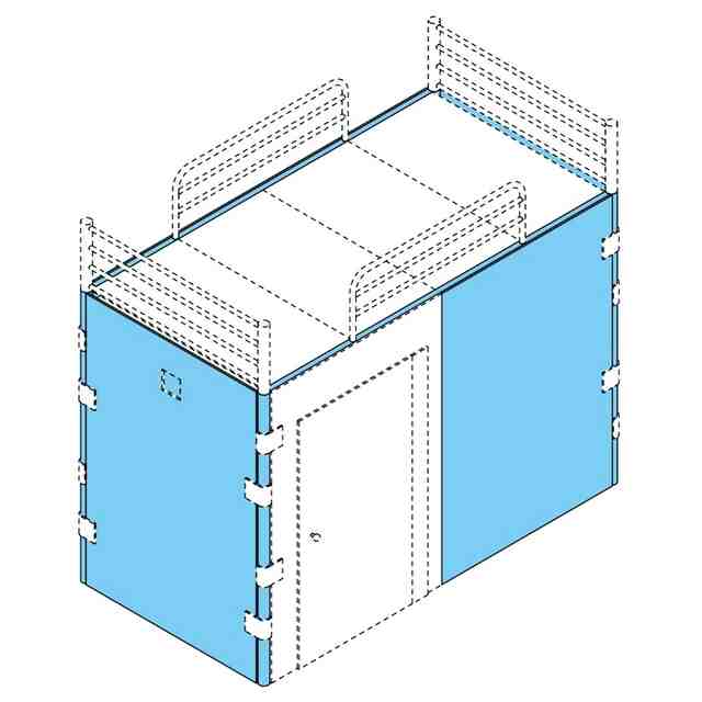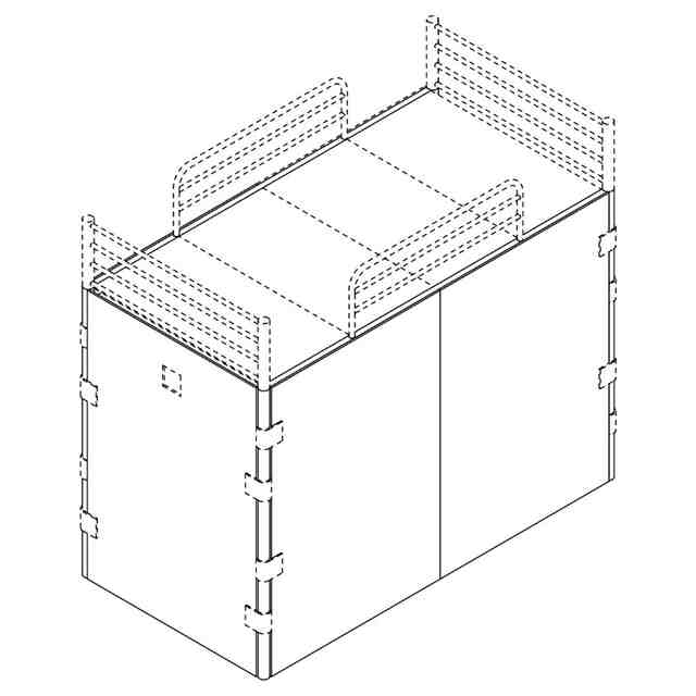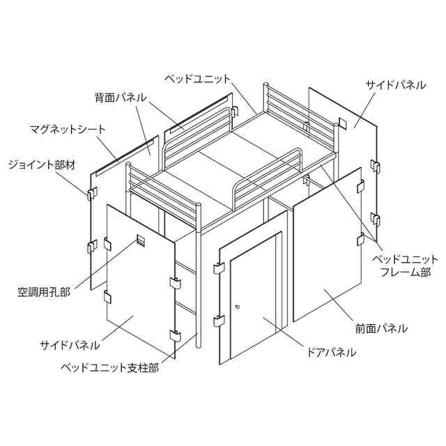 本物品は、「各部の名称を示す参考図」に示すようにベッドユニット支柱部にジョイント部材を有するパネルを固定することでベッドユニット下方に防音ブースを設けた防音ブース付ベッドである。前面パネル、ドアパネル及び背面パネルには当該ジョイント部材の他、上方にマグネットシートが配され、ベッドユニットフレーム部に吸着させて固定するものである。