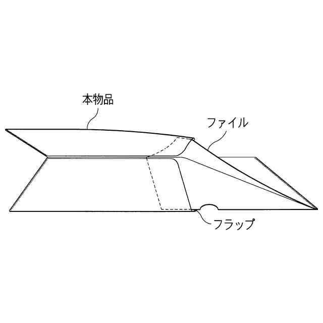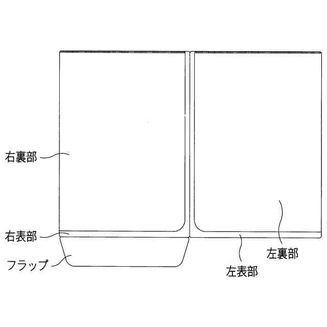 本物品は、ファイルを覆うためのクリアファイルカバーである。使用状態を示す参考斜視図に示すように、ファイルの右側部分を本物品の右表部及び右裏部の間に挿入し、ファイルの左側部分を左表部及び左裏部の間に挿入して、ファイルを本物品に収納させる。 使用状態を示す参考正面図は閉じた状態を示す。使用状態を示す参考正面図に示すように、フラップを折り畳んで左表部及び左裏部の間に挿入することによって、収納されたファイルの底が保持され、ファイルの脱落が防止される。 閉じた状態の背面図は、背面図における本物品の左側部分を右に折り畳み、フラップを折り畳んで、左表部及び左裏部の間に挿入した状態を示す。A-A′、B-B′部分拡大図に示すように、閉じた状態において、本物品の右縁部は左縁部よりも右側に突出する。突出した部分は手掛け部として機能する。
