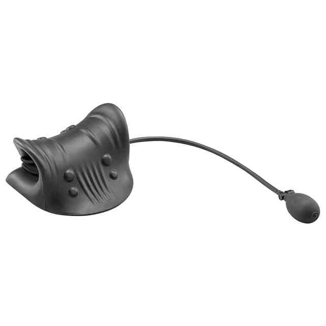 本物品は、エアー注入式の首用ストレッチ器具である。斜視図の右側部分にチューブ状に表れる部分の先端がポンプ部である。このポンプ部の操作により、右側面図の右側中央に示されるヒダ部分の空気量の調節が可能である。ヒダ部分の空気量により首筋への勾配を調節できるため、使用者の首筋にフィットしやすい構造になっている。また、正面図、背面図及び平面図等に示されるように、本体の首、頭を支える部分に大きさの異なる突起を備えた形状となっている。