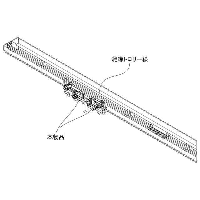本物品は、使用状態を示す参考図に示すように、絶縁トロリー線に取り付けて使用され、例えば、本物品に取り付けられたクレーン等の機器に絶縁トロリー線から給電を行う。