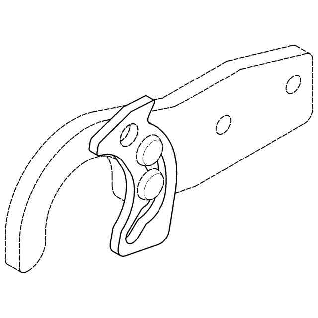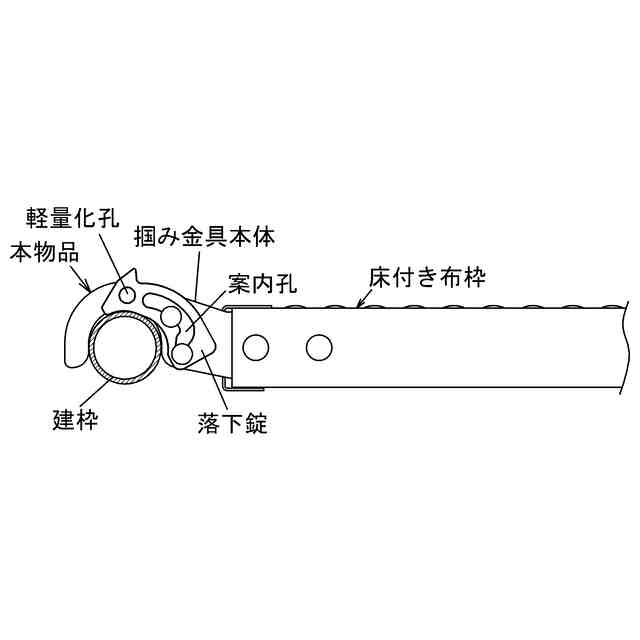 本物品は、建設現場等で仮設足場に用いられ、足場板と補強枠が一体となった床付き布枠を構成する鋼製の部材である。本物品は、使用状態を示す参考図1に示すように、床付き布枠の四隅に取り付けられ、布枠本体の長手方向の端部から外側へ向け突出して建枠に掛け止めるための掴み金具である。本物品は、使用状態を示す参考図2に示すように、厚手の金属プレートからなる掴み金具本体に、建枠から掴み金具が外れて床付き布枠が落下することを防止する落下錠が揺動自在にリベット止めされている。また、本物品の落下錠は、床付き布枠の片側を持ち上げた後、解除した落下錠が再度、建枠の横地材に掛け止められないように、落下錠の揺動方向を案内する案内孔の分岐部分により、使用状態を示す参考図3に示す状態に、落下錠が揺動しないように一時的に掛け止められて預けられる預け機能が付与されている。