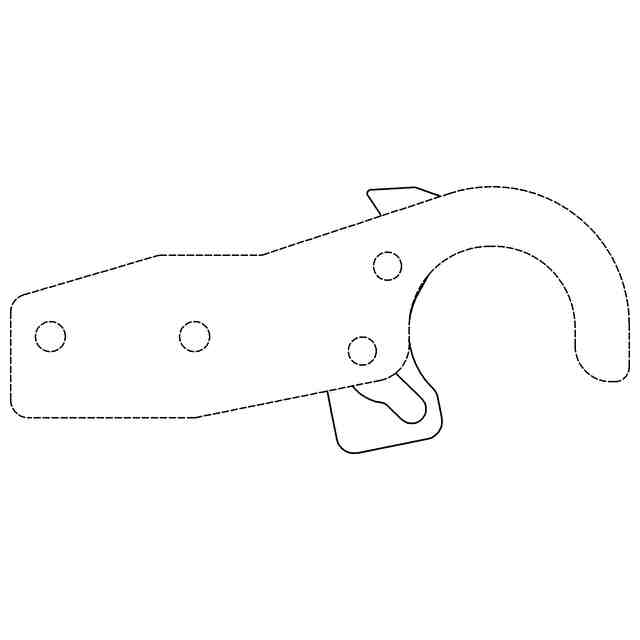 実線で表された部分が、部分意匠として意匠登録を受けようとする部分である。意匠登録を受けようとする部分は、軽量化のために穿設された軽量化孔を除く、落下錠の外形及び案内孔部分である。