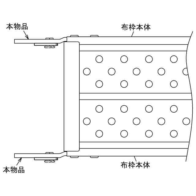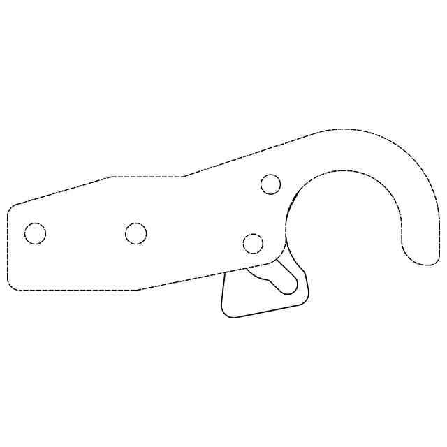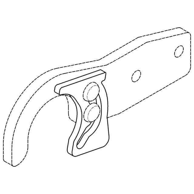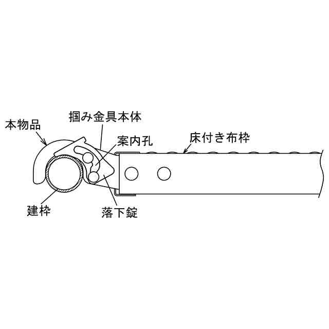 本物品は、建設現場等で仮設足場に用いられ、足場板と補強枠が一体となった床付き布枠を構成する鋼製の部材である。本物品は、使用状態を示す参考図1に示すように、床付き布枠の四隅に取り付けられ、布枠本体の長手方向の端部から外側へ向け突出して建枠に掛け止めるための掴み金具である。本物品は、使用状態を示す参考図2に示すように、厚手の金属プレートからなる掴み金具本体に、建枠から掴み金具が外れて床付き布枠が落下することを防止する落下錠が揺動自在にリベット止めされている。また、本物品の落下錠は、床付き布枠の片側を持ち上げた後、解除した落下錠が再度、建枠の横地材に掛け止められないように、落下錠の揺動方向を案内する案内孔の分岐部分により、使用状態を示す参考図3に示す状態に、落下錠が揺動しないように一時的に掛け止められて預けられる預け機能が付与されている。