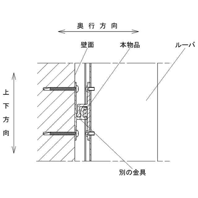 本物品は、使用状態参考図1に示すように、建築物の壁面にルーバを取り付けるためのもので、ルーバに固定される。ルーバは、本物品を壁面に固定された別の金具に係合させることで、壁面に取り付けられる。