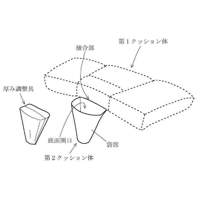 本物品の枕は、第1クッション体と、第2クッション体とが接続した枕である。第2クッション体は、底面開口の袋部を有し、袋部に厚み調整具を挿入することが可能である。「厚み調整具の出入可能状態を示す斜視図」に表されるように、第2クッション体の袋部の底面開口の底辺が、第1クッション体の正面側底辺中央と接合されている。第2クッション体は、第1クッション体に対して回動可能で、袋部の底面開口が第1クッション体の後端面から離間して開放されると厚み調整具の出入可能となる。