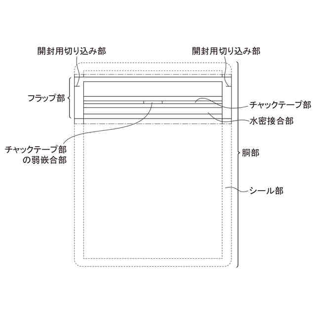 本物品は、電子レンジによる加熱調理に用いることのできる包装用袋である。本物品の使用の際には、例えば、調理用調味料が胴部に収容された状態で販売される。そして、購入者(一般消費者)は、フラップ部の開封用切り込み部から開封して開口部とし、チャックテープ部及び水密接合部を開放して、外部と本物品の内部(フラップ部、胴部の内部)とがつながる状態として、食材や具材を本物品に投入し、チャックテープ部を再び嵌合させて封止し、電子レンジで加熱調理を行うことができる。加熱調理が完了した後は、胴部の開封用切り込み部から開封し、加熱調理済みの食材等を取り出すことができる。フラップ部の水密接合部は、フラップ部の開封前に、胴部に収容した調理用調味料等がチャックテープ部に接触することを防ぐために、チャックテープ部と胴部の内部とを隔てるためのものである。チャックテープ部の弱嵌合部は、加熱調理時に、本物品の内圧が上昇することによって嵌合が解放されて蒸気を外部に逃がす機構(蒸気抜き機構)として作用する。