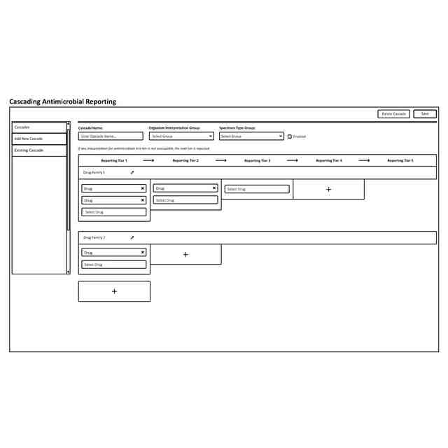 本画像は、抗菌薬などの薬剤の感受性結果を表示するためのグラフィカルユーザーインターフェースである。画像図1ないし9に表れる画像は変化する画像である。すなわち、本画像では、抗菌薬などの薬剤の感受性試験のカスケード(段階)に関する情報が入力されると、追加のフィールドが表示され、これらのフィールドに入力がされると、カスケードが完了するまでさらに追加のフィールドが表示される。