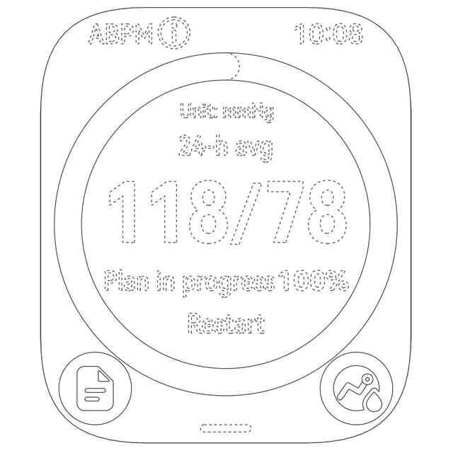 本願意匠に係るグラフィカルユーザーインターフェース(GUI)は、時計、血圧の測定に関する測定結果、進捗状況など、身体に関する情報を表示する機能を有する画像である。