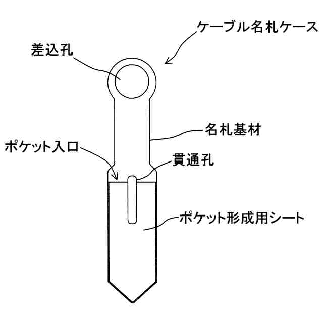 本物品は、各種ケーブルに名付け等をする際に使用されるケーブル名札ケースである。本物品は、所望の番号や記号、文字等を記載した名札シートをポケット内に収納して使用される。「各部の名称を示す参考図」や「各部の名称を示す参考右側面図」に示すように、本物品は、名札基材の下部にポケット形成用シートが貼着されており、名札基材の下部とポケット形成用シートとの間で、名札シートを収納可能なポケットが形成されている。このポケットは、上方にポケット入口を有する。なお、ポケット形成用シートは、透明材料から形成されており、「名札シートをポケットに収納した状態の参考図」に示すように、名札シートに記載されている番号や記号、文字等を外部から視認可能に構成される。また、名札シートがポケット内に収納された本物品は、「ポケット形成部分を差込孔に通した状態の参考図」や「ポケット形成部分を差込孔に通した状態の参考右側面図」に示すように、ケーブルに巻く形態でポケット形成部分を差込孔に差し込んで通してケーブルに取り付ける。本物品は、ポケット入口に重なる位置に、名札基台及びポケット形成用シートを共に貫通する貫通孔が形成されているため、ポケット入口部分を、「効果を説明する参考図」に示すように、名札基台とポケット形成用シートとを共に左右方向から押し込むことで、ポケット入口が開きやすくなり、ポケット内に名札シートが収納しやすくなる。また、例えば、貫通孔を介して、手指や棒状体を用いて名札シートを動かすことかできる。