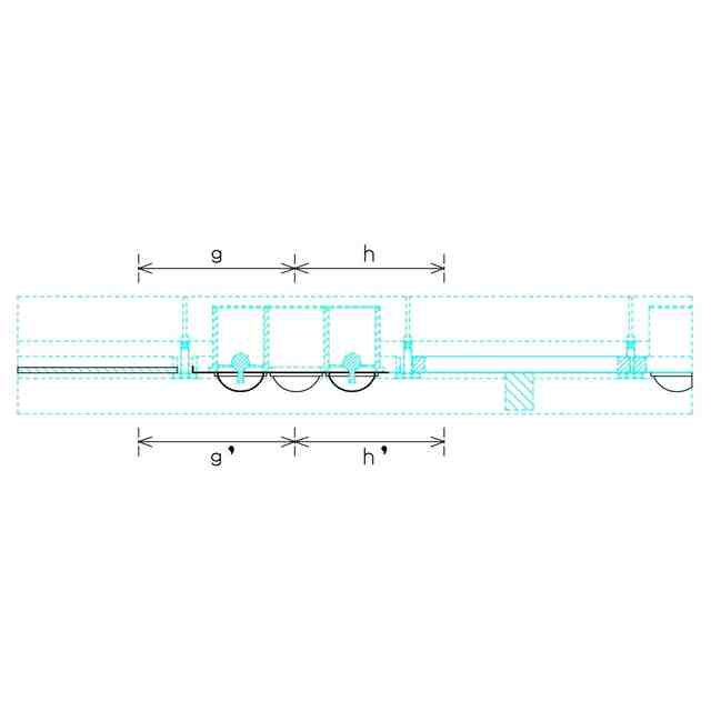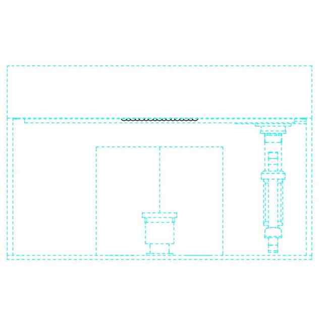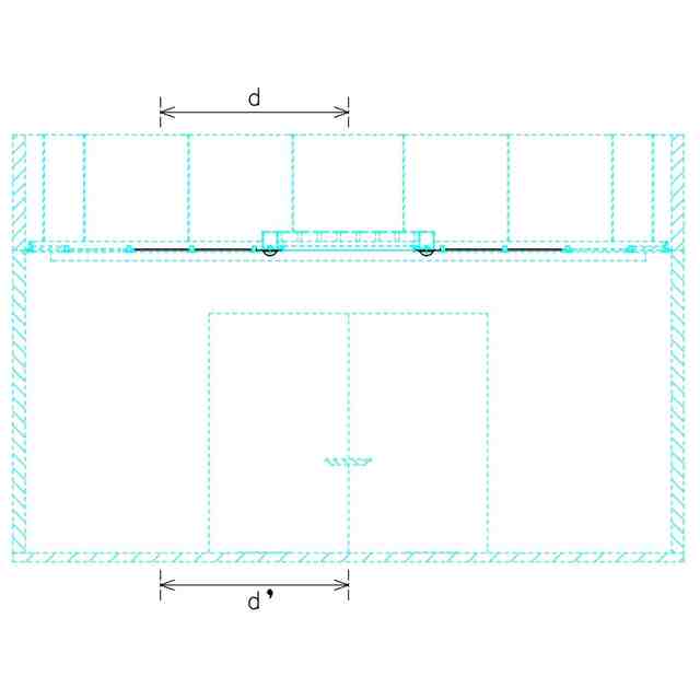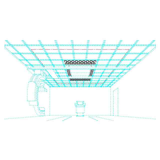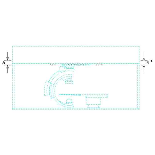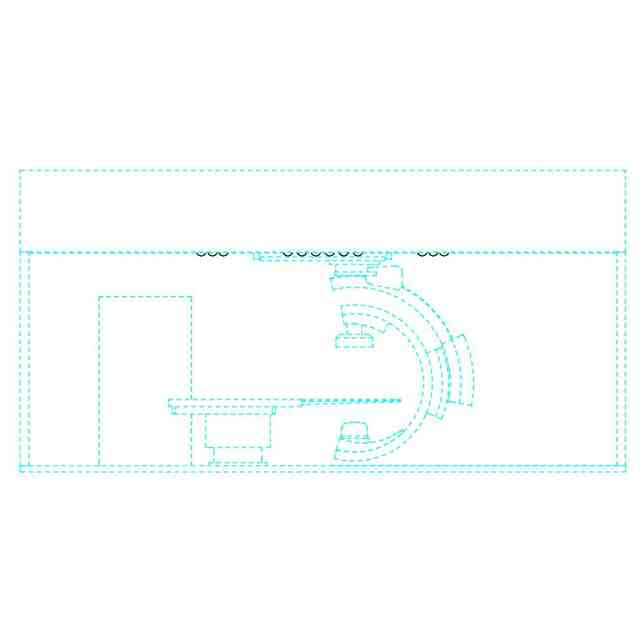 意匠登録を受けようとする部分を黒色の実線でそれ以外の部分を青色の破線で表した。赤色の一点鎖線は、意匠登録を受けようとする部分とそれ以外の部分との境界のみを示すものである。各断面図、各端面図とエア吹出口を表した状態の各図及びこれらの拡大図以外の図において、クリーンエア吹出パネルに設けられたエア吹出口(複数小孔)を省略している。正面・底面・左側面側からの斜視図は、正面及び左側面側の壁と床を省略した状態で表している。正面図、背面図、左右側面図は、各図手前に表れる壁を、底面図は床を省略した状態で表している。A-A拡大断面図は左に90度回転させて表している。A-A拡大断面図及びB-B拡大断面図は、手術台を表した状態で表している。各断面図、各端面図において、内部構造及び内部機構を簡略化して表している。床や壁、天井内部は簡略化して表している。登録を受けようとする部分を示す参考図において、意匠登録を受けようとする部分に薄墨を施した。透光性を有する部分を示す参考図において薄墨を施した部分は面発光照明部分であり、透光性を有する。透明部を示す参考図において薄墨を施した部分は、シューティングライトのドーム状前面カバーであって透明である。なお、血管撮影装置を手術台に設置した状態の各図は、血管撮影装置本体を移動体とともに移動レールに沿って移動させ、手術台の方向に合わせて回動させた状態を表している。