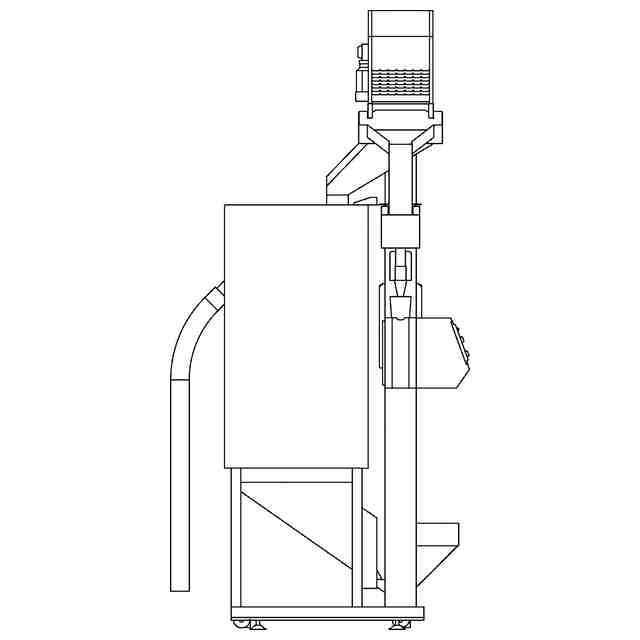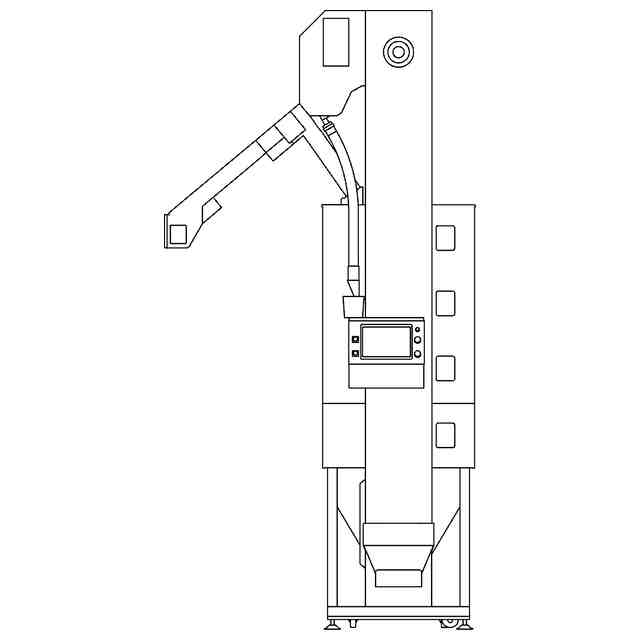 本物品は、米などの穀類を一定重量計量して袋詰するための穀類計量袋詰機である。正面図や参考斜視図に示すように、昇降機の前面下部に張込みホッパが設けられるとともに、昇降機の前面中央部に操作パネルが設置されているので、張込みホッパへの配管設置の融通性と本物品の操作性が向上している。昇降機上部には、排出樋を介してコンテナ投入シュートと返還シュートとが分岐して設けられている。もみすり・粒選別などの調製作業が終了した穀類は、まず、張込みホッパに投入される。張込みホッパに投入された穀類は、次に、昇降機によって上方へ揚穀され、コンテナ投入シュート側又は返還シュート側に分岐される。コンテナ投入シュート側に分岐された場合は、穀類は計量器及びパレット上に載置されたフレキシブルコンテナなどの米袋に一定重量となるまで投入される。一方、返還シュート側に分岐された場合は、穀類はバッファタンクに投入されて一時貯留されることになる。一時貯留された穀類はバッファタンク下部のシャッタを開放すれば、再度、昇降機によって上方へ揚穀されるようになっている。
