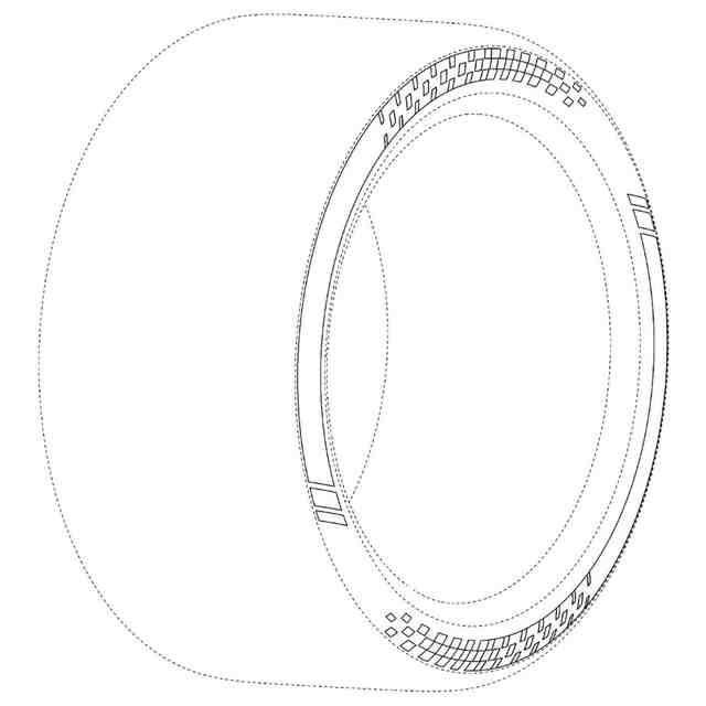 実線で表された部分が、意匠登録を受けようとする部分である。タイヤの側面に表れるパターンは模様である。