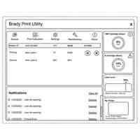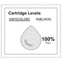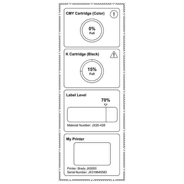 本画像は、ラベルプリンター等のプリンターに接続された表示画面に表示され、例えば、カラーカートリッジの残量、ラベルの残量、プリンター名が表示される。