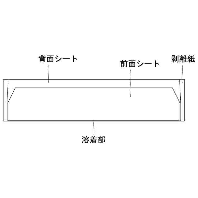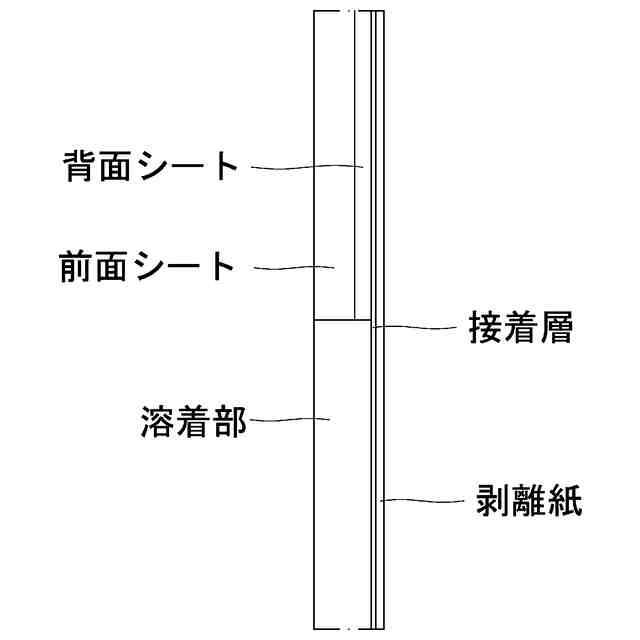 前面シート、背面シート、溶着部および接着層は透明である。前面シートは、硬質ポリ塩化ビニル等の硬質樹脂等が使用される。背面シートは、軟質ポリ塩化ビニル等の軟質樹脂等が使用される。本物品の大きさは、幅240mm、高さ54mmである。前面シート、背面シート、接着層および剥離紙の厚さは、それぞれ0.4mm、0.2mm、0.06mm、0.1mmである。