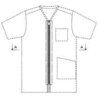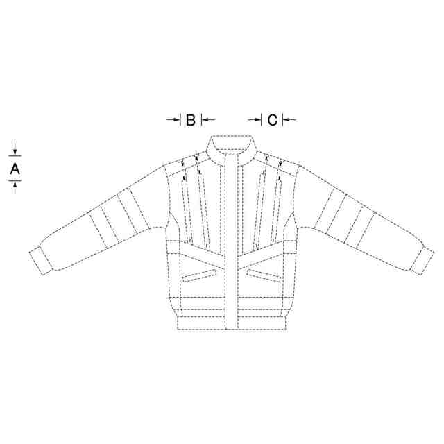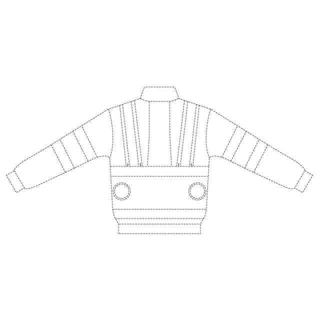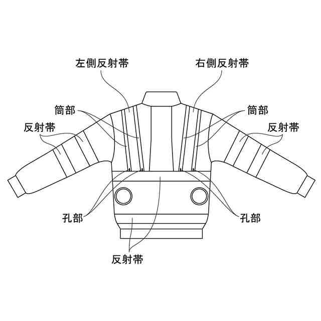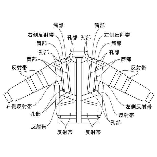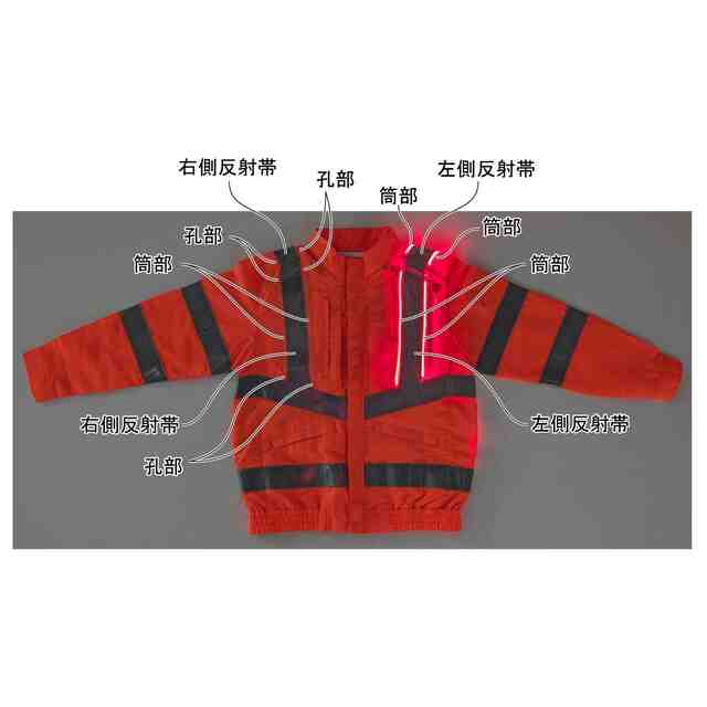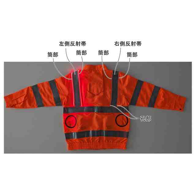 本物品は、各参考図に示すように、反射帯と筒部が縫製され、孔部が設けられているものである。筒部と孔部は、ファイバーライトを通すために設けられている。各参考図に示すように、筒部と孔部は、前身頃から左肩を通過して後身頃まで延びる着用時の左側反射帯と、前身頃から右肩を通過して後身頃まで延びる着用時の右側反射帯のそれぞれの両脇に設けられている。筒部は透明体である。使用状態を示す各参考図では、ファイバーライトの有無を示すために、着用時の左側の筒部及び孔部には点灯状態のファイバーライトを通し、着用時の右側の筒部及び孔部にはファイバーライトを通していない。