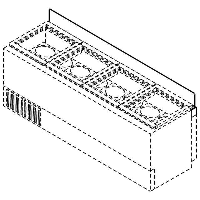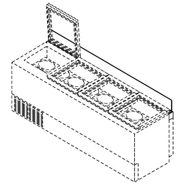 本物品は、アイスクリーム等の冷凍食材を保冷および陳列することが可能な冷凍ショーケースである。B-B断面図における手挟み防止板部分の参考拡大図から明らかなように、扉開閉ヒンジを隠す位置に手挟み防止板が設けられており、使用者が正面側から本物品に手を伸ばした際にヒンジや開閉扉で手を挟むことを防止する役割を果たす。