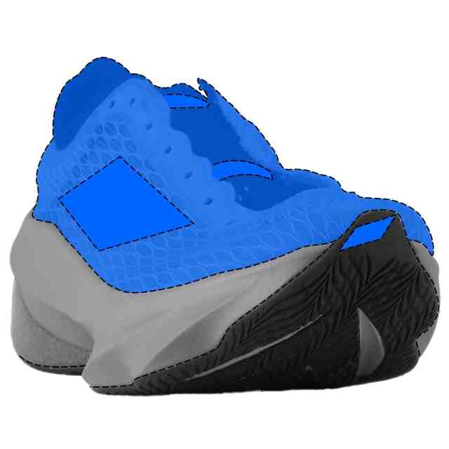 破線で表された部分以外の部分及び青色で着色した部分以外の部分が、意匠登録を受けようとする部分である。ミッドソール部分とアウトソール部分の間に表れる破線は、ミッドソール部分とアウトソール部分の境界を示す線であって、意匠登録を受けようとする部分以外の部分である。各図の表面部全面に表された濃淡は、いずれも立体表面の形状を特定するためのものである。