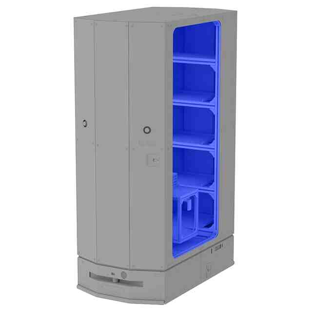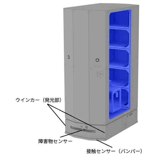 本物品は、物流倉庫等で、棚から荷物を移載してストックする機能を備え、作業場まで運搬する自走式の搬送用ロボットである。