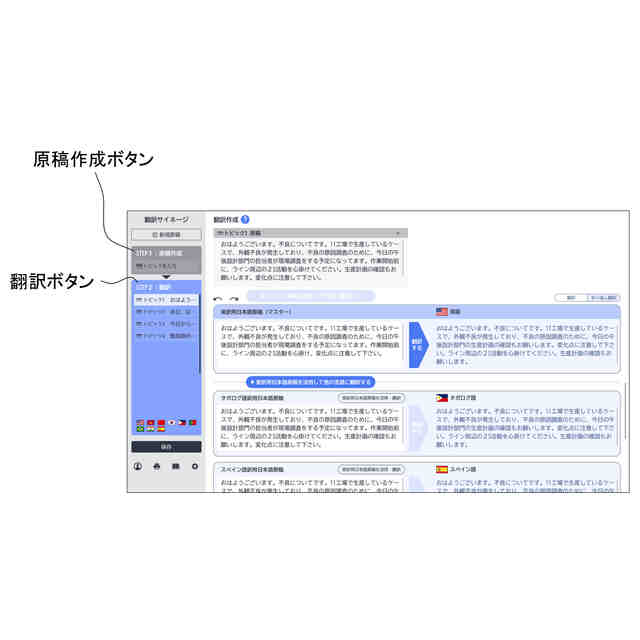 本意匠は、翻訳を行いたい母語の原稿作成および当該原稿の翻訳原稿を作成するための原稿作成用画像である。原稿作成ボタンを押下すると、母語の原稿作成用画面が表示されるものである。翻訳ボタンを押下して原稿作成ステップから翻訳作成ステップへ遷移すると、母語で作成した原稿と共に、他国の言語に翻訳するための翻訳用母語原稿と、他国の言語へ翻訳した内容を再度母語へと翻訳し直した内容が表示されるものである。