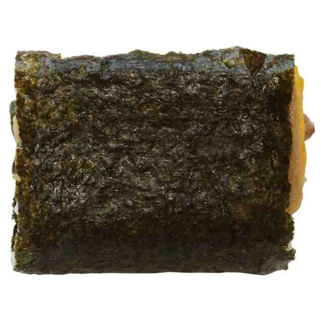 本物品は、2つ折りした扁平状の海苔付き米飯の間に、複数の具材を挟み込んだおにぎりである。各部の名称を示す参考図のように、上下の米飯の間の各具材はそれぞれ、たまねぎ、ししとう、鶏もも肉、卵焼き、ランチョンミート、である。本物品は、斜視図、正面図、右側面図及び左側面図に示すように各具材の全てが、斜め上側、正面側及び左右側面から視認できる。