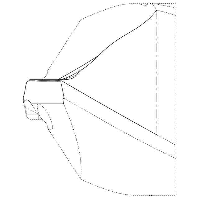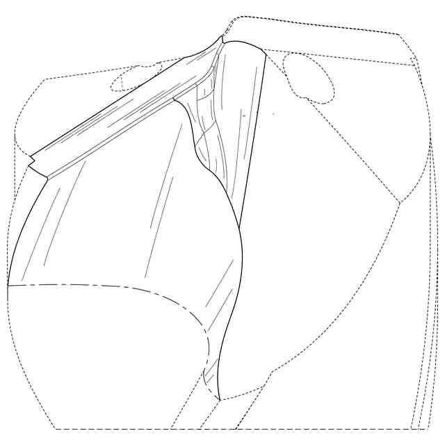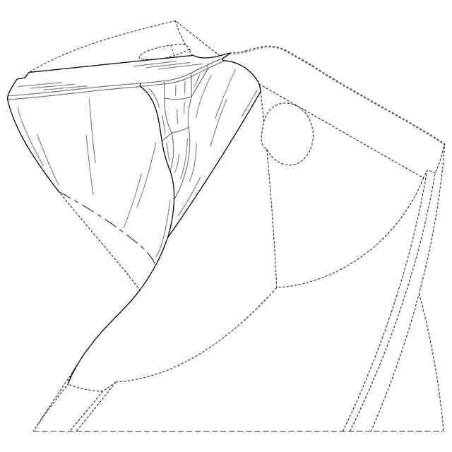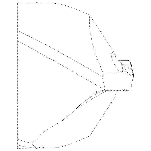 破線で表した部分を除き、実線で表した部分が登録を受けようとする部分である。一点鎖線は、意匠登録を受けようとする部分とその他の部分との境界のみを示す線である。E-E部分拡大図およびF-F部分拡大図の各々において実線および一点鎖線で囲まれた領域に表わされた細線は、いずれも立体表面の形状を特定するためのものである。