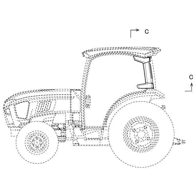 本物品の右側部における正背寄りの位置に表れる縦長略台形部(「E-E部分拡大図」参照)は、後部ピラーと一体的に構成されたリヤコンビ―ネーションランプである。