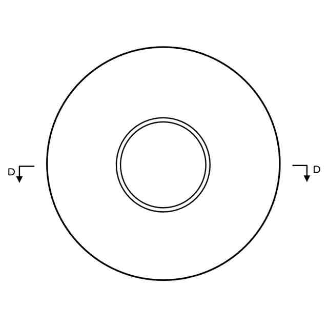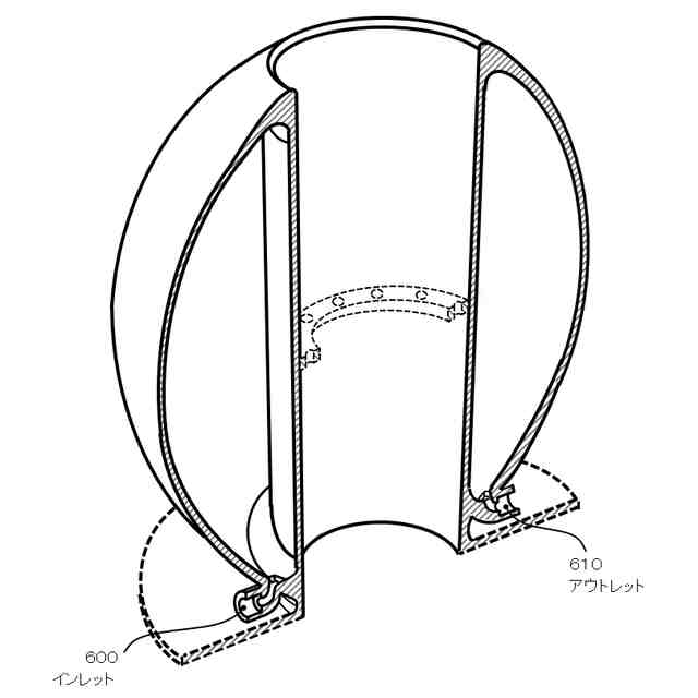 実線で表した部分が、部分意匠として意匠登録を受けようとする部分である。 なお、C-C断面図は、B-B断面図と同じであるため省略する。 参考図1は、D-D断面斜視図をベースに、本願意匠の概略構成を示した参考図である。 参考図2は、D-D断面斜視図をベースに、ロケットエンジンと組み合わせた場合の一例を示す参考図である。 参考図3は、D-D断面図をベースに、ロケットエンジンと組み合わせた場合の一例を示す参考図である。 参考図4は、D-D断面斜視図をベースに、酸化剤又は燃料の注入用のインレットないし、酸化剤又は燃料をロケットエンジンへ供給するためのアウトレットを設けた場合の一例を示す参考図である。 参考図5は、本創作の外殻トーラス柱状構造のタンクにおける、内部の酸化剤等の自己加圧による応力の発生の概念図である。 参考図1に示すように、一般的な球状のタンクとは異なり、タンクの内側に略円柱状の構造体として柱状部300(青色の部位)を設けたことにより、柱状部300と外殻部100とで連続した形状を構成し、外殻部100の厚みを薄くして全体を軽量化しても、液体燃料又は酸化剤の圧力に耐える強度を確保することが可能となる。 より具体的には、外殻部の外側のライン110(赤色のライン)と柱状部の内側のライン310(青色のライン)、及び、外殻部の内側ライン120(朱色のライン)と柱状部の外側ライン320(青色のライン)とが、連続したラインを構成し、全体として、外側がトーラス状で、内側が柱状の構造である、外殻トーラス柱状構造を形成することにより、外殻部100の赤道付近150の厚み(t1)を薄くしても、液体燃料又は酸化剤の圧力に耐える強度を確保することが可能となる。 また、参考図2、参考図3に示すように、柱状部300の内側の空洞部には、ロケットエンジン用の格納部400を構成して、ロケットエンジン700を格納することができる。その際、タンクの内側にロケットエンジン固定用のフランジ410を設けて、ロケットエンジン700をボルト等で固定することができる。 このため、タンクを支持するための構造を別途設ける必要がなくなるので、前記の外殻部の厚みを薄くできることと相まって、タンク全体の重量を軽量化することに貢献する。 なお、参考図4に示すように、外殻部100ないし柱状部300の一部には液体燃料又は酸化剤の注入用のインレットないし、ロケットエンジンへ供給するためのアウトレットを設けることができる。 また、参考図5に示すように、(1)内部の自己加圧で白色矢印方向の応力が発生すると、柱状構造の存在により、天頂付近160及び天底付近170を起点として、赤道付近150に至るまで、引っ張る方向の応力が発生し(青色矢印)、これに伴って、(2)引っ張る方向の応力が増加することにより、外側から押し付ける灰色の太矢印方向の応力が増加する構造になっている。 また、参考図5の左側の外殻の一部を拡大した図(点線で囲んだ図)に、外殻の微小部位に発生する応力の詳細を示した。拡大図によれば、天頂付近160及び天底付近170を起点として発生した引っ張る方向の応力によって、単なる球形状等で内側に柱状部がない構造と比較して、微小部位の周囲に円周方向にやや湾曲した方向の応力(青色矢印)が増加するので、張力を合成した応力(灰色の太矢印)も大きくなることがわかる。このため、単なる球形状で内側に柱状部がない構造に対し、外殻の厚みを薄くしても強度を確保することが可能となる。