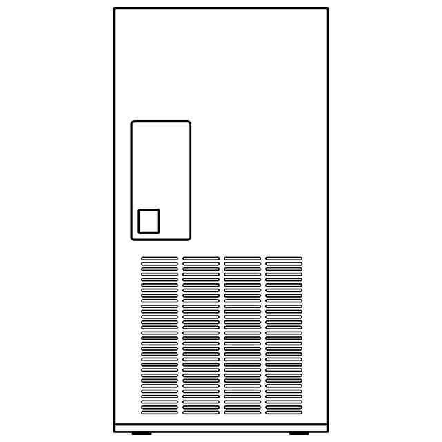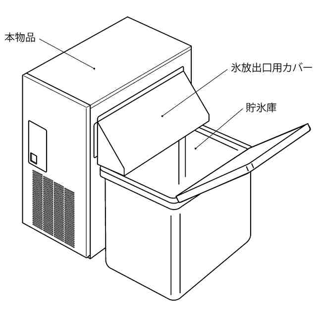 この意匠に係る物品は、側面に氷放出口を設けた製氷機である。使用状態を示す参考図に示すように貯氷庫の側部等に配置し、氷放出口に取り付けられた氷放出口用カバーに沿って氷を貯氷庫等に放出することが可能である。