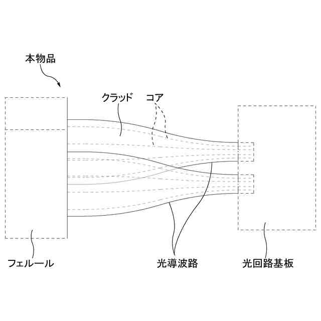 本物品は、通信に光を用いる伝送路である光モジュールであり、各部の名称を示す参考図に示すように、一端から他端に向けて幅が異なるシート状の光導波路と、光導波路の一端が接続されるフェルールと、光導波路の他端が接続される光回路基板と、有する。上下に並べて配置された一対の光導波路は、少なくとも一部が平面視で重なるように配置される。光導波路は、光路となるコアと、コアを取り囲むクラッドと、を有する。点線で表される複数のコアは、クラッド内で幅方向に並べて配置され、光の伝搬方向の一端側と他端側とで隣接するコア同士のピッチを変更する変形領域を有しており、用途に応じてコアの数や形状が適宜変更される。