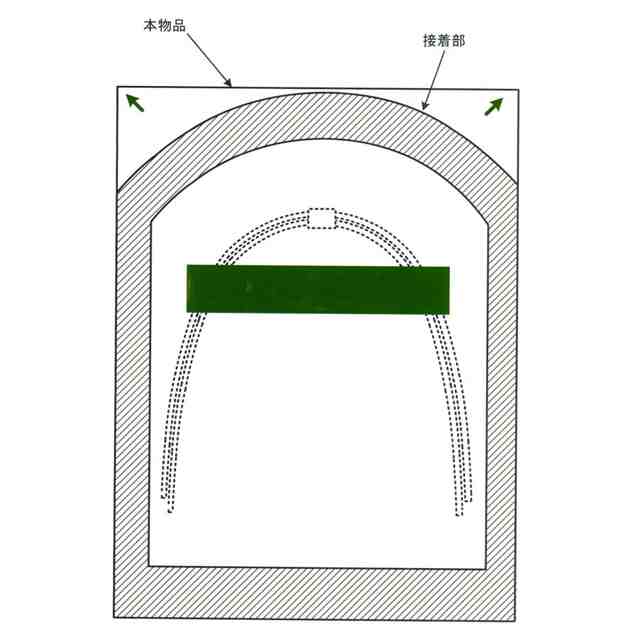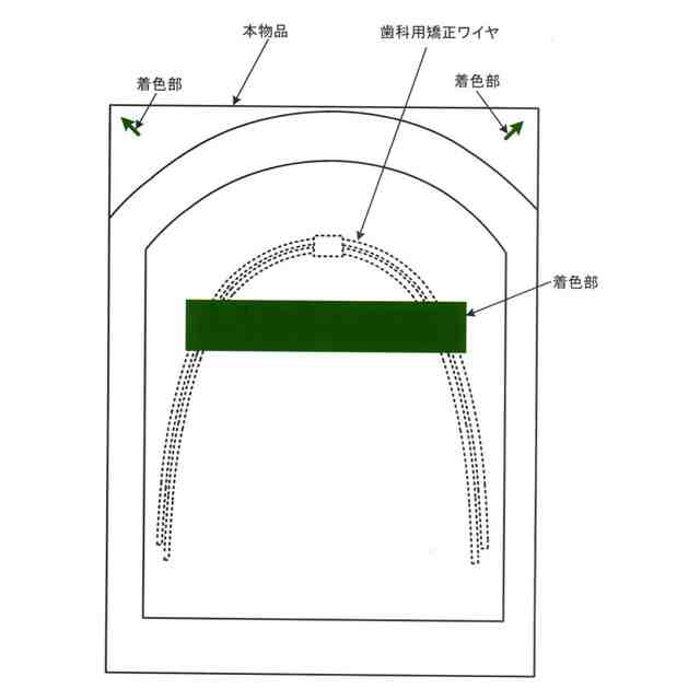 本物品は、歯科矯正の際に用いられるワイヤを具備する歯科矯正用ワイヤを封入した、歯科矯正用ワイヤ入り包装用袋である。包装用袋は正面図に表れるシートと背面図に表れるシートとが重ね合わされており、「接着部を表す参考正面図」でハッチングして示した「接着部」で両シートが接着されている。