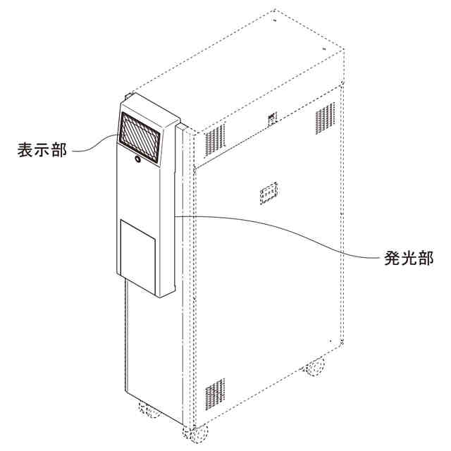 本物品は、平板状の正面部の上側に、表示部を正面上側に、発光部を左右側面に有する縦長略直方体状部を備えた純水製造機である。本物品は、水等から不純物を取り除くことにより純水等を製造する。表示部はタッチパネル式で操作に使用する。発光部は細長帯状の孔部で、内蔵したLEDの光を外部に漏らすことで照明を行う。本物品は、給水口部から水等を取り入れて、送水口部から純水等を外部へと供給する。