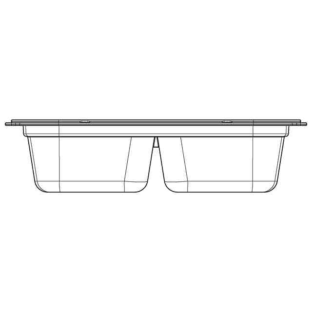 本願意匠に係る物品(以下「本物品」という。)は、加工済み又は調理済の食品などを保存する際に用いられる食品保存容器である。本物品は、上方に開口する開口部を有する平面視で略矩形状の容器本体と、この容器本体の開口部を閉塞する蓋体とを備えている。本物品の容器本体は、開口部の周縁より外方へ張り出す周縁部と、この周縁部の内側より一段低い位置を周方向へ延びる環状の段差部と、この段差部の内側の領域においてそれぞれ区画された2つの収容部とを備えている。本物品の2つの収容部は、容器本体の段差部の長手方向の中央を短手方向に連結する連結部によって互いに同じ大きさに区画されている。そして、本物品の2つの収容部は、容器本体の段差部及び連結部の内側よりそれぞれ底部に近付くに従い次第に細くなる四角推台である略逆四角柱状に形成され、同じような大きさ及び同量の食品などの保存に供されるように同じ大きさとなっている。一方、本物品の蓋体は、容器本体の周縁部に対し閉塞時に当接する環状の外側当接片と、この外側当接片の内側に設けられ、容器本体の段差部及び連結部に対し閉塞時に当接した状態で容器本体の開口部を閉塞しつつ両収容部間での食品の流通を遮断する内側当接片とを備えている。また、本物品の容器本体の周縁部の長手方向両端部は、短手方向両端部を残して中央部を開口部側に凹ませた凹部をそれぞれ有している一方、蓋体の長手方向両端部は、短手方向両端部よりも中央部を容器本体の各凹部よりも外方へ円弧状に膨出させた膨出部をそれぞれ有していて、蓋体を開放する際に容器本体の各凹部を介して各膨出部を下方から直に持ち上げて蓋体の開放がスムーズに行えるようにしている。