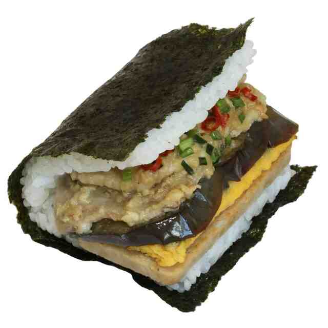 本物品は、2つ折りした扁平状の海苔付き米飯の間に、複数の具材を挟み込んだおにぎりである。各部の名称を示す参考図のように、上下の米飯の間の各具材はそれぞれ、青ネギ、味噌だれ、豚肩ロース薄切り、唐辛子、茄子、卵焼き、ランチョンミート、である。本物品は、斜視図、正面図、右側面図及び左側面図に示すように各具材の全てが、斜め上側、正面側及び左右側面から視認できる。