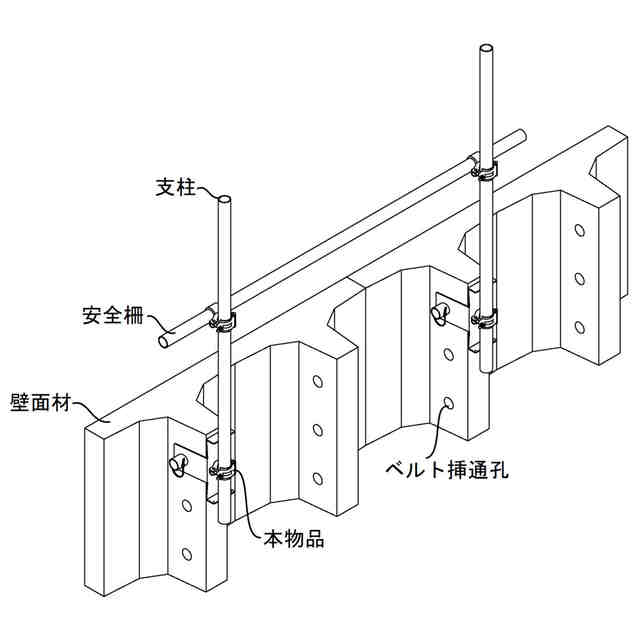 本物品は、盛土構造体の前面に壁面材を積み上げて覆った補強土壁の構築工事において、壁面材の本体に安全柵用支柱(単管パイプ)を仮止めするための金具である。メインプレート、クランプ部、固定用パイプ及び抜け止めピンより成る。固定用パイプはメインプレートから取り外すことが可能である。 本物品を壁面材に取り付ける際は、まず壁面材の凸部をメインプレートで挟み込み、壁面材に空いたベルト挿通孔に本物品の固定用パイプを挿通して固定する。その後、固定用パイプに抜け止めピンを取り付け、最後にクランプ部で安全柵用の支柱を締結して使用する。