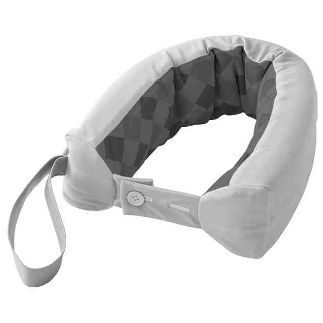 本物品は、首用のクッションである。正面図、斜視図等に棒状に表される状態が、伸ばした状態である。右側面図、左側面図の形状が、蒲鉾形状になっている。使用状態を示す参考図1、使用状態を示す参考図2に表されるように、自由変形が可能であり、使用者の好みの角度に折り曲げて使用することが出来る。正面図及び斜視図の左側にループ状に表れる部分は、収納時に使用する結束バンドである。収納状態を示す参考図1、収納状態を示す参考図2に示されるように、ロール状に巻き付けた状態で、結束バンドを止めることにより、コンパクトに収納することが出来る。この結束バンドは、使用状態を示す参考図3に表されるように、ファスナー内部に収納可能である。