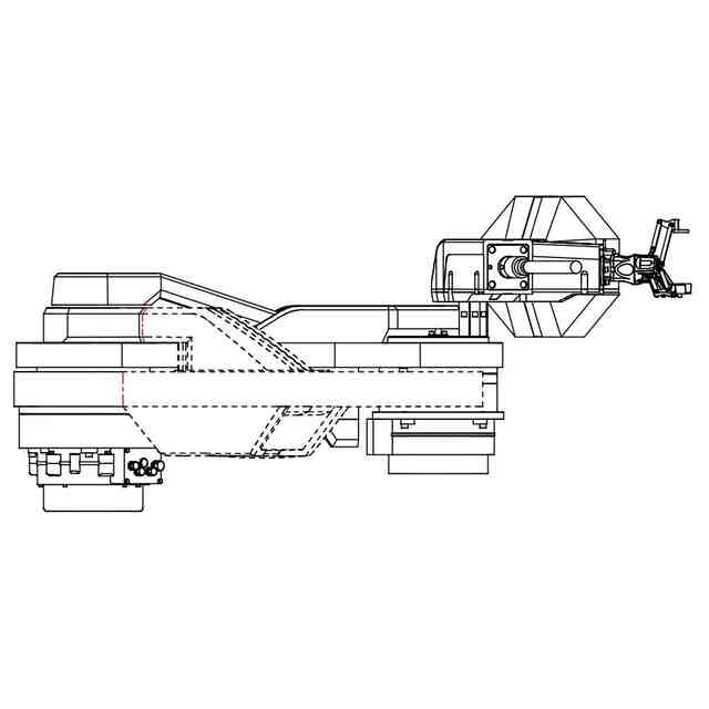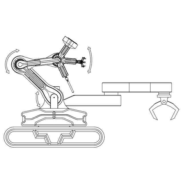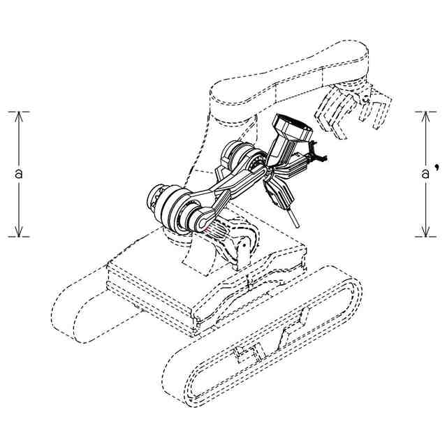 この意匠に係る物品は、運転席を有さず無人運転を可能とした、電動建設機械である。使用状態を示す参考図に示すように、電動アクチュエータを搭載しているため、回転軸ごとに動かすことができる。各部の名称を示す参考図に示すように、第1アームには、グラインダー、ロボットハンド及びドリルが装着されており、それぞれ取り替えて使用することができる。