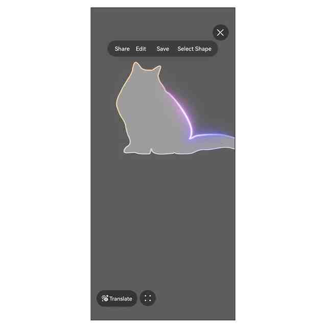 本GUIは、画面の一部を選択して識別させるために表示されるものである。画像図は、ユーザーが識別させたい領域を指等でタップして選択した状態を表している。当該領域が選択されると、画像図は、変化後の画像図1、変化後の画像図2、変化後の画像図3を経て、変化後の画像図4に遷移する。変化後の画像図1、変化後の画像図2及び変化後の画像図3は、選択された当該領域が識別されてゆく過程を表している。変化後の画像図4は、識別された領域を共有、編集、翻訳、保存し、又は刈り取ることを可能とする画像要素を表示している。