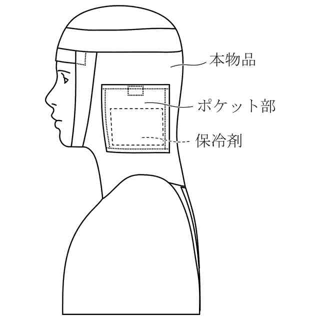 本物品は、食品工場等での作業時に着用する衛生帽子であって、保冷剤を収容するポケット部を有する。使用状態を示す参考図1及び2は、ポケット部に保冷剤を収容した状態を示す。