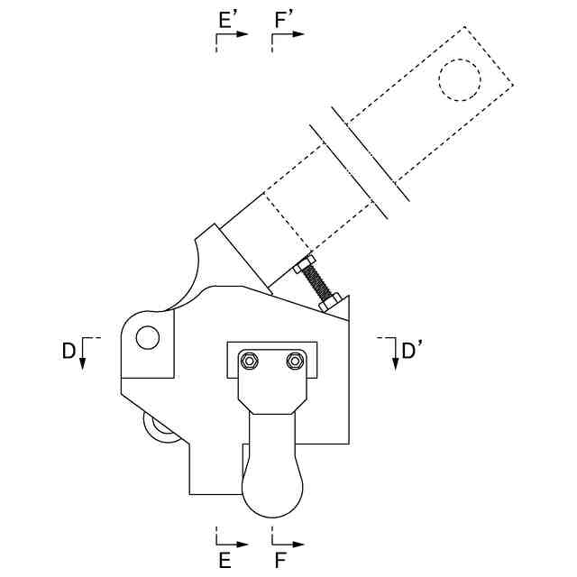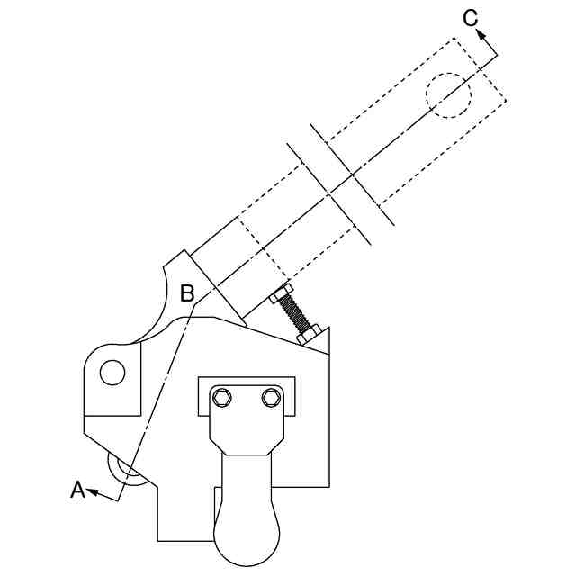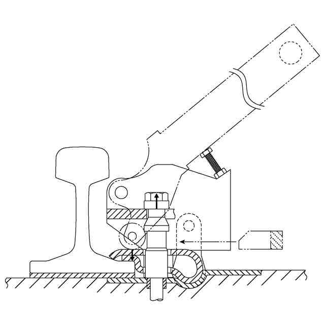 本意匠に係る物品は、各部の機能を示す参考図に示すように、まくらぎ又はタイプレートのような支持体にレールを板ばねによって締結するために使用されるレール締結用工具である。このレール締結用工具は、使用状態を示す参考図1のように、姿勢保持部A,Bを支持体に接触させてフレーム部の姿勢を一定に保持し、フレーム部に支点で回転自在に支持されるアーム部の先端の荷重作用部Aを板ばねに接触させ、フレーム部の荷重作用部Bを締結ボルトの荷重受け部に接触させた状態で、アームを回転開始位置から回転させ、使用状態を示す参考図2のように、回転規制部と接触する回転終了位置までアームを回転させて、荷重作用部Aから板ばねに下向きの荷重F1を作用させ、荷重作用部Bから上向きの荷重F2を作用させ、板ばねと締結ボルトとの間に隙間を形成し、使用状態を示す参考図3のように、この隙間に調整用座金を挟み込む。