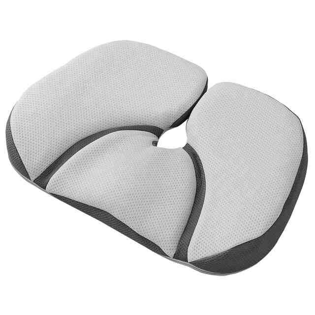 本物品は、使用者が椅子の上に置いて着座するクッションである。平面図、斜視図等に示されるように、クッション中央に穴を設け、穴より後方部分が二股に分かれており、使用者の坐骨部分に合わせて自由に開閉調節が可能である。これは、使用者が着座した際、穴部分と穴の後方二股部分で空洞を作ることにより、坐骨部分にクッションが直接当たらないように設計したものである。また、正面図の中央に示される部分が山型に隆起しており、その両外側部分は、外側から内側に向かって緩やかな傾斜を持つ形状を呈している。これは、使用者が着座した際、座面前方の形状が使用者の両太腿をホールドしながら坐骨を立たせるようにサポートし、座り姿勢を安定させるものである。