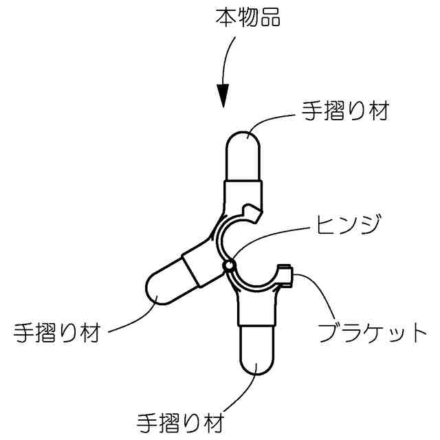 本物品は、一対のブラケットと、端部が各ブラケットに連結される3本の手摺り材とからなる手摺りであり、例えば床面と天井面との間に突っ張り状に設置される支柱にブラケットを固定して使用されるものである。ブラケットは、支柱を抱持するように固定される閉じ姿勢と、参考平面図に示す、支柱に取り付ける際の開き姿勢との間で、ヒンジまわりに姿勢変更可能である。各手摺り材は、掴み持つための把持部と、把持部の各端部に連続してブラケットに連結される連結部とを備えており、3本の手摺り材は、平面視でブラケット(支柱)の中心に対して等角度位置に配置されている。