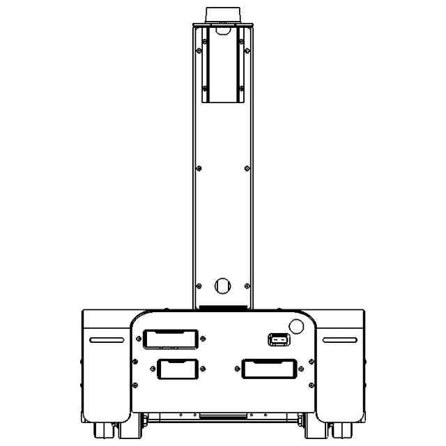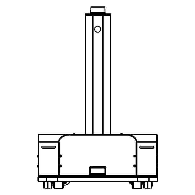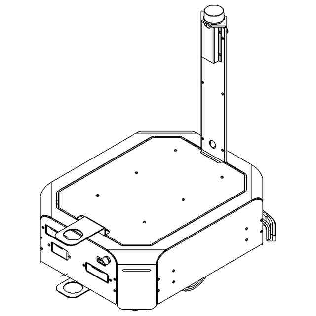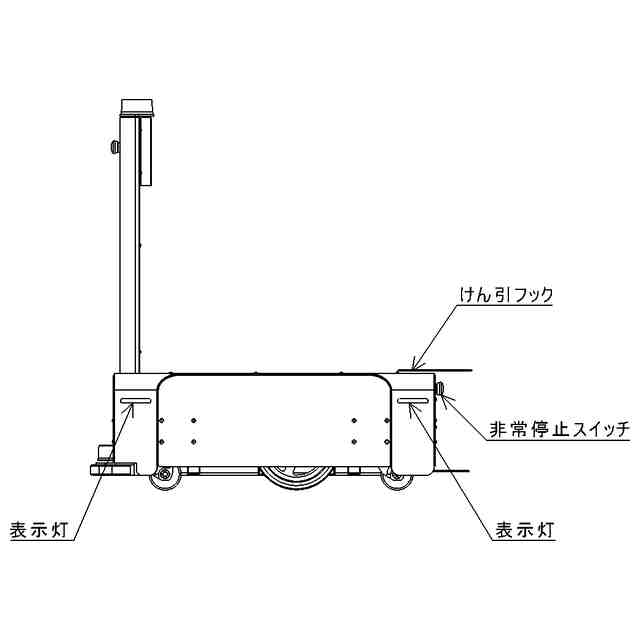 本物品は、工場、倉庫、ホテル、病院、図書館、オフィス等の施設内で、部品や製品などの搬送に用いられる無人搬送車である。本物品の後方側には、搬送対象物を載せた台車などをけん引するためのけん引フックが設けられ、前方の上面には棒状の台が設けられ、底面側には、一対の駆動輪が設けられるとともに、四隅に近い位置に従動輪が設けられ、前方の側面と、棒状の台の上には、自己位置の計測や障害物の検知に用いるLiDARなどのセンサーが設けられ、本物品本体を上方から見た時の略長方形の4つ角の切頂部分の側面には、本物品の動作状態を示す表示灯が設けられている。搬送物を搭載した台車などを、直接または連結治具等を用いて、けん引フックに連結してけん引する。この搬送物をけん引して走行することで無人にて各種搬送物の搬送が可能となる。なお、本物品は、磁気誘導やSLAM誘導などの方式に対応して走行することが可能である。また、搬送等の動作中に非常停止スイッチを押すことにより、動作が停止される。