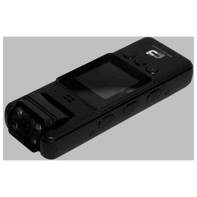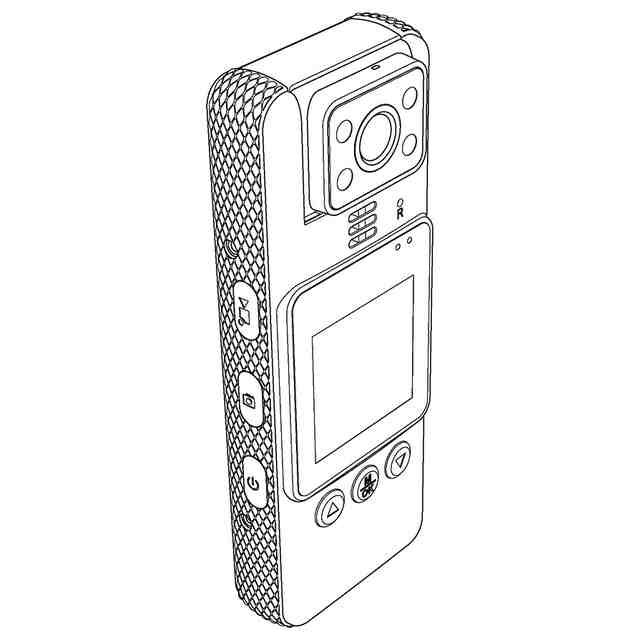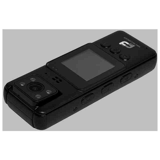 本物品は、例えば、各種の設備や機械の点検作業や検査作業時における動画や音声等を記録できる、携帯が可能な小型の情報記録機である。本物品は、縦長の本体の上部に、カメラ部分を備えている。このカメラ部分は傾動可能で、カメラ部分の角度を調整することができる(参考斜視図、使用状態参考斜視図1・2・3参照)。また、本物品は、縦長の本体の前面部に、録画している映像等を表示する液晶画面を備えている。記録者は、本体の前面部の液晶画面が見えるように本体を手に持ち、カメラ部分を傾動させて本体の裏面側に向ければ(使用状態参考斜視図3参照)、各種の動画の内容を液晶画面により確認しながら、その動画の内容を記録することができる。また、カメラ部分を傾動させて本体の液晶画面側に向けた状態とし(参考斜視図参照)、記録者は本体の裏面側が見えるように本体を手に持った場合、或いは、付属のクリップマウント等を用いて本体を記録者の作業服に取り付けた場合、動画を撮られる作業者側が、各種の動画の内容を液晶画面により確認することができる。この他、カメラ部分を傾動させて本体の上方に向けた状態とし(使用状態参考斜視図2参照)、このカメラ部分が記録者の前方を向くように、本体をヘルメットに取り付けた場合には、記録者の前方の動画を記録することができる。このように、本体のカメラ部分の角度を調整することができるので(使用状態参考斜視図1・2・3参照)、現場に応じた様々な動画を、簡単に記録することができる。