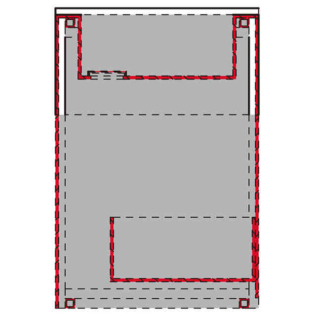 薄墨を施した部分を除く部分、及び、断面図において実線で表した部分が、意匠登録を受けようとする部分である。断面図に表れる赤色は、断面形状のみを表すものである。断面図、拡大断面図、拡大正面図、斜視図を含めて、意匠登録を受けようとする部分を特定している。物品の内部に備えられる、引出の摺動部や給排水等の設備については、意匠登録を受けようとする部分ではなく省略している。